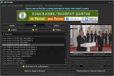 Функциональность не ограничивается просмотром и прослушиванием. All-Radio позволяет записывать как аудиоэфир, так и телевизионные трансляции. Пользователь может самостоятельно выбрать параметры сохранения — формат файла, битрейт и продолжительность записи.