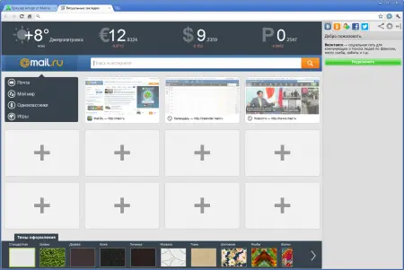 Дополнительно в браузер встроен медиаплеер, позволяющий искать музыку и видеоролики из соцсетей, выбирать качество воспроизведения и формировать собственные плейлисты. Над омнибоксом отображается полезная информация — прогноз погоды, курсы валют и другие актуальные данные.