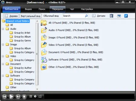 Интерфейс программы прост и русифицирован. Вкладки в верхней части окна обеспечивают быстрый переход к библиотеке, поиску, чату, медиаплееру и настройкам. В разделе параметров можно указать папки для общего доступа, задать сетевые ограничения и изменить внешний вид клиента.