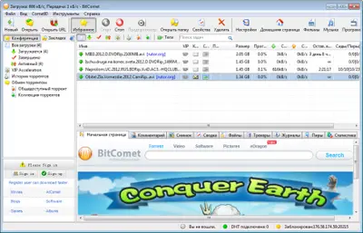 BitComet — бесплатный торрент-клиент для загрузки файлов через P2P-сети. Помимо стандартных функций (параллельные закачки и настройка приоритетов), программа содержит встроенную базу трекеров, что упрощает поиск и подключение к раздачам.