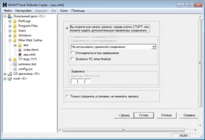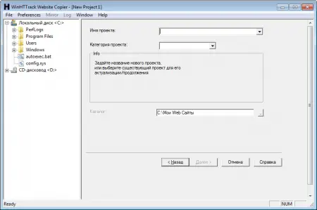 Во время создания проекта мастер настройки позволяет указать глубину сканирования, ограничения по размеру файлов, типы загружаемых данных и другие параметры. Можно исключить определённые разделы, запретить загрузку медиа или ограничить скорость скачивания.