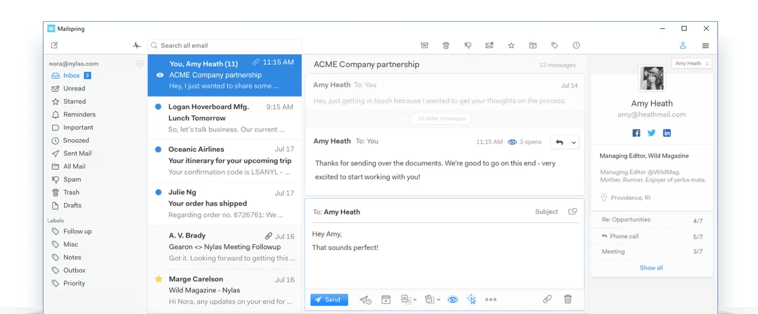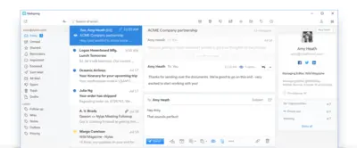 Редактор писем в Mailspring отличается гибкостью: поддерживаются шаблоны, форматирование, вставка изображений и проверка орфографии. Пользователи также получают доступ к таким функциям, как отложенная отправка писем, напоминания о важных сообщениях и возможность временно скрывать письма с помощью функции Snooze.