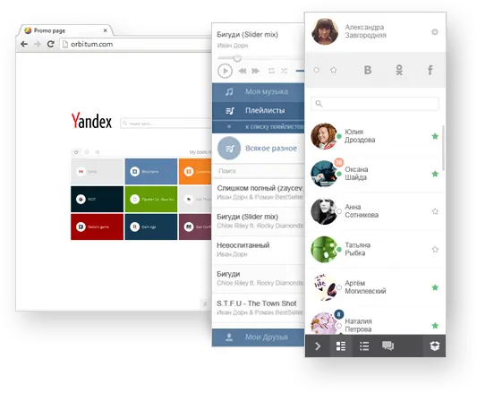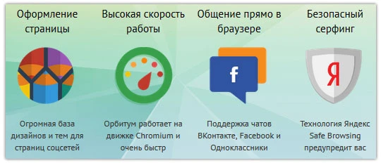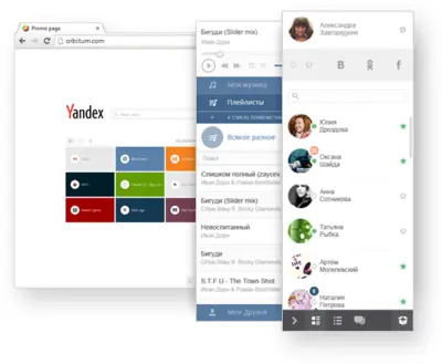 Orbitum особенно удобен для пользователей, которые активно проводят время в интернете и социальных сетях. Браузер позволяет одновременно читать сайты, слушать музыку и переписываться в Одноклассниках, ВКонтакте и Facebook, не отвлекаясь на постоянное переключение вкладок.