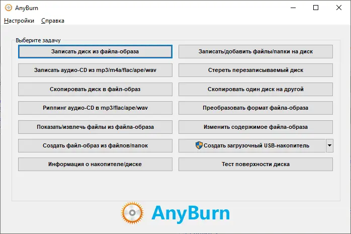 AnyBurn — компактная и бесплатная программа для работы с оптическими носителями CD, DVD и Blu-ray. Утилита отличается простотой и небольшим размером, при этом предоставляет все основные функции для записи и управления дисками. Интерфейс организован в виде удобного меню с разделами, где пользователь может выбрать нужную операцию — запись данных, создание образов, копирование дисков и другие задачи.