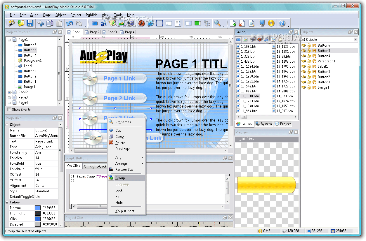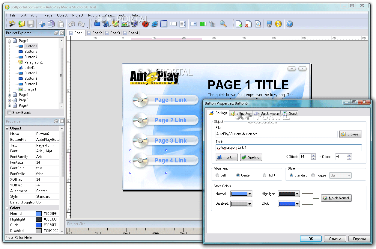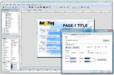 Проекты в AutoPlay Media Studio строятся на основе объектной модели. Каждый проект состоит из набора страниц, на которых можно размещать различные элементы интерфейса и мультимедиа. Среди поддерживаемых объектов: