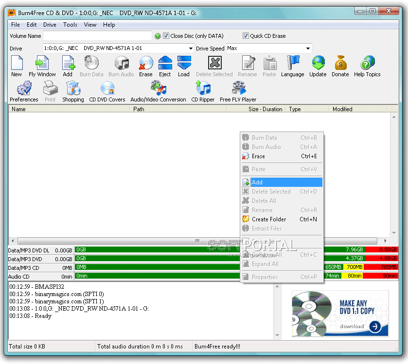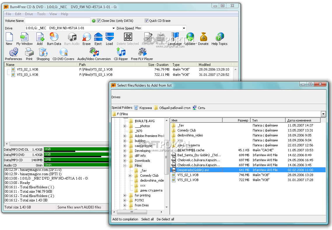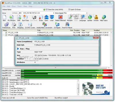 Burn4Free — бесплатная и удобная программа для записи CD и DVD дисков. Несмотря на простой интерфейс, приложение обладает достаточно широким набором функций и подходит как для начинающих пользователей, так и для тех, кому нужен быстрый инструмент для записи данных или музыки на оптические носители.