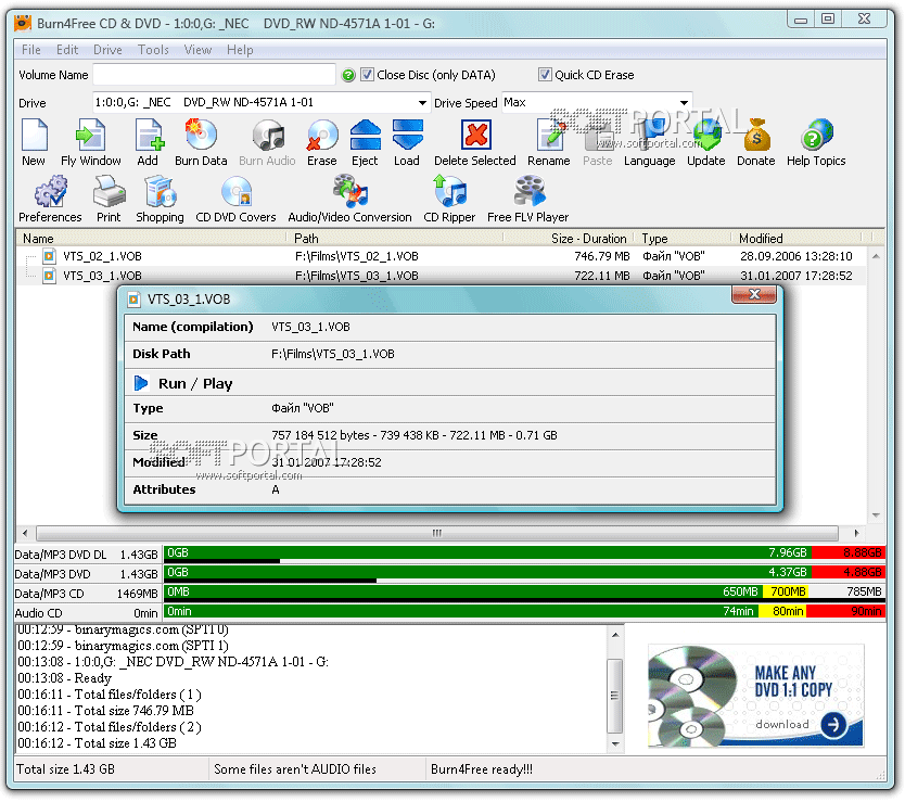 Burn4Free поддерживает работу с большинством современных оптических приводов и различными типами дисков, включая двухслойные DVD. Также утилита умеет работать с образами ISO — их можно сохранять на компьютере или записывать на диск.