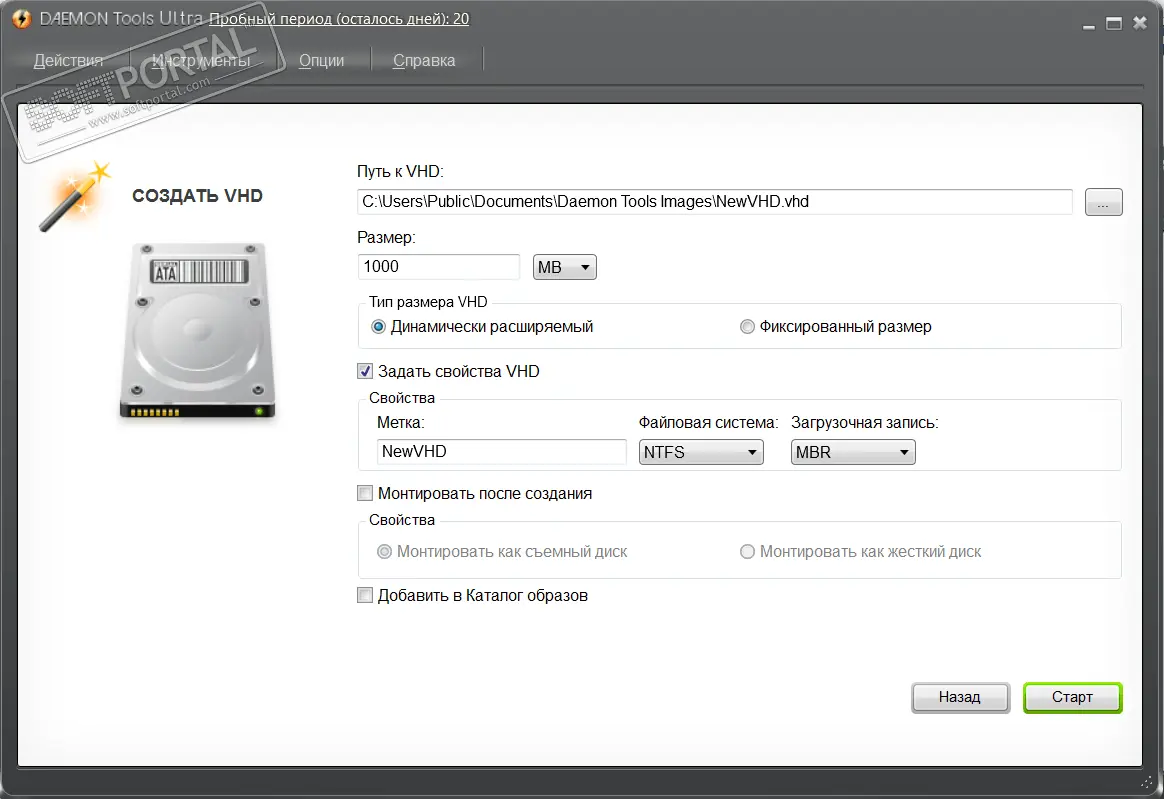 Еще одна полезная функция программы — создание и управление виртуальными жесткими дисками формата VHD. Такие диски позволяют хранить данные в виде отдельных файлов-контейнеров и использовать их как обычные накопители.