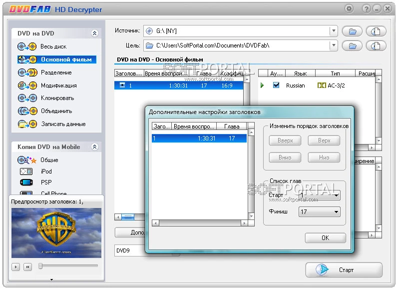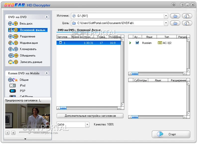DVDFab — это мощная программа для копирования и резервного сохранения содержимого DVD-дисков без потери качества изображения и звука. Приложение позволяет переносить видеоданные с оптических носителей на жесткий диск компьютера или создавать точные копии дисков для последующей записи. Программа полностью поддерживает стандарты NTSC и PAL, благодаря чему корректно работает с видеоматериалами различных регионов.