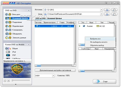 Одним из главных преимуществ DVDFab является простота использования. Основные функции доступны через удобный интерфейс, а дополнительные параметры и расширенные настройки можно открыть через контекстное меню, вызываемое правой кнопкой мыши. Это позволяет быстро выполнять стандартные операции и при необходимости использовать более глубокие возможности программы.