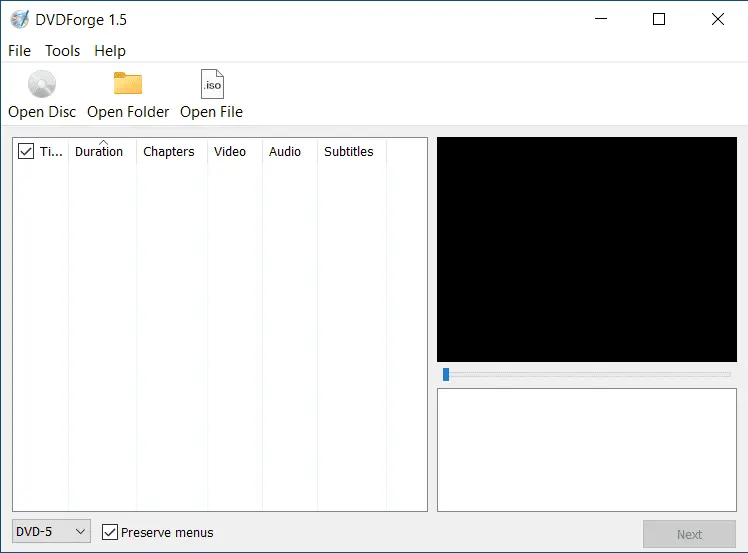 DVDForge анализирует структуру DVD и отображает подробную информацию о содержимом диска. Пользователь может увидеть названия глав, продолжительность каждого фрагмента, параметры видео и аудио, а также другую техническую информацию. Для дополнительного удобства предусмотрена панель предварительного просмотра, позволяющая убедиться, что выбранные данные соответствуют нужному фильму или видеоматериалу.