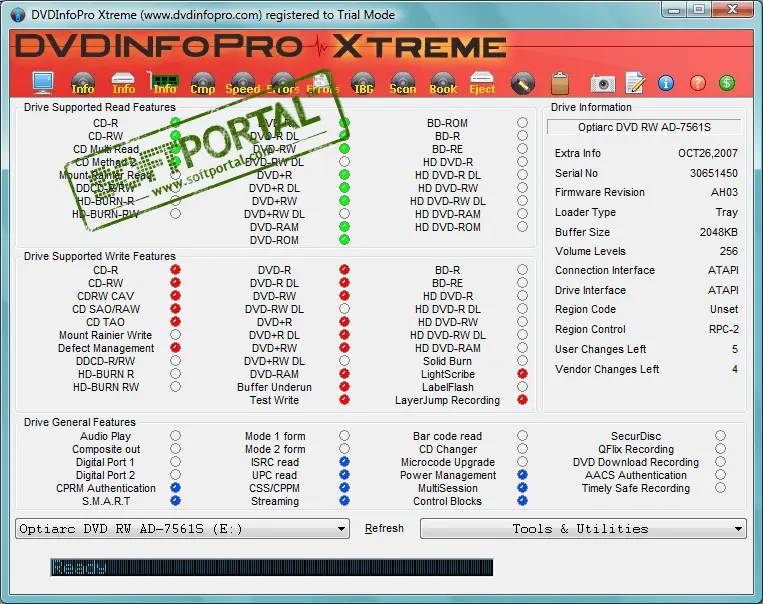 DVDInfoPro — это многофункциональная программа, предназначенная для диагностики оптических приводов и получения подробной информации о CD, DVD и Blu-ray устройствах. Утилита позволяет анализировать характеристики приводов, тестировать носители, а также выполнять различные операции с дисками, включая создание образов и стирание данных.