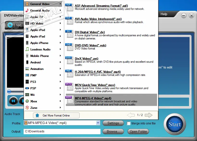 DVDVideoMedia Free DVD Ripper предлагает готовые профили конвертации для различных устройств. Пользователь может выбрать шаблон, оптимизированный под конкретную платформу, например: