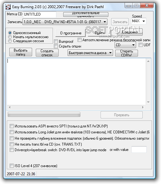С помощью EASY Burning можно записывать обычные диски с данными, а также мультисессионные носители, которые позволяют добавлять новую информацию на диск в несколько этапов. Программа автоматически определяет все доступные в системе записывающие приводы и позволяет выбрать нужное устройство перед началом записи.