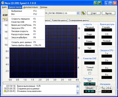 Утилита также может проверять поддержку различных функций привода, включая возможность пережига (overburning). Кроме того, программа отображает степень загрузки процессора при чтении данных с диска на разных скоростях.