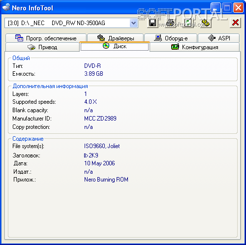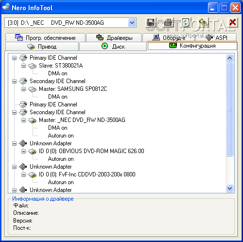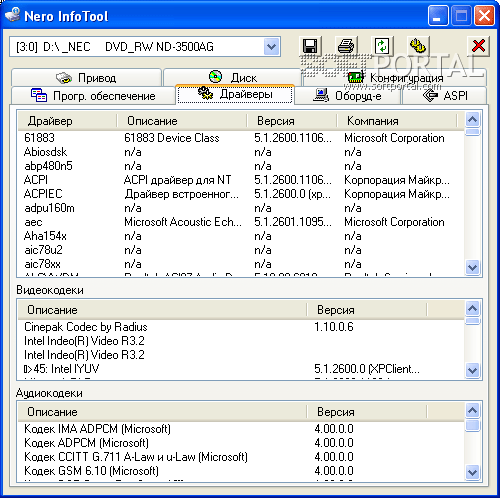 Nero InfoTool показывает сведения о конфигурации дисковой подсистемы компьютера, включая подключенные устройства и установленные драйверы. Кроме того, программа отображает данные о специализированном программном обеспечении, связанном с записью и работой с оптическими носителями.