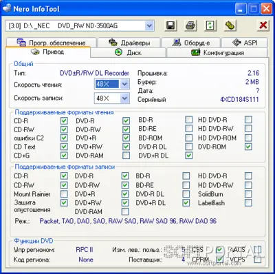 Nero InfoTool позволяет просмотреть подробные технические характеристики установленных CD/DVD-приводов. Пользователь может узнать: