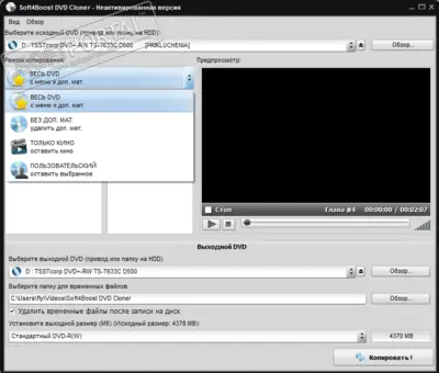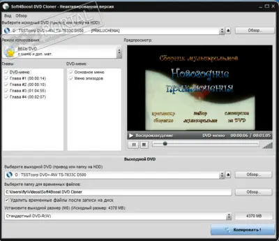Soft4Boost DVD Cloner — удобная и функциональная программа для копирования DVD-дисков. Приложение позволяет быстро создавать точные копии фильмов и других данных с сохранением качества изображения и звука. Благодаря простому и понятному интерфейсу пользоваться программой легко даже тем, кто впервые работает с подобными инструментами.