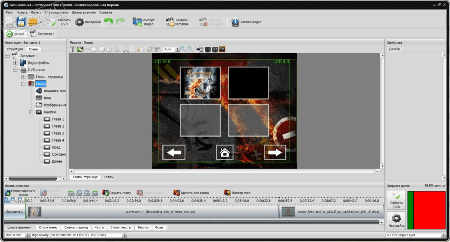 Программа предоставляет все основные инструменты, необходимые для создания полноценного DVD-проекта. Пользователь может разделить видео на главы, создать титульную страницу, настроить дизайн меню и добавить фоновую музыку или изображения. Это позволяет оформить диск более профессионально и сделать навигацию по видеоматериалу удобной.