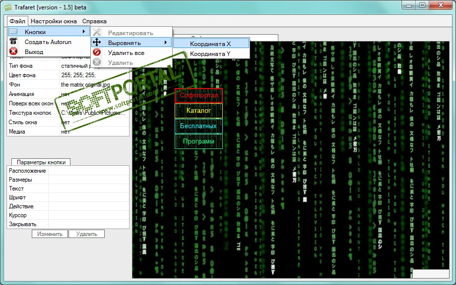 Программа предоставляет ряд инструментов для настройки внешнего вида меню. Пользователь может изменять текстуры кнопок, настраивать их размеры, размещать элементы интерфейса по координатам и аккуратно выравнивать кнопки на экране. Кроме того, доступна возможность устанавливать фоновое изображение, что позволяет создавать более привлекательный и индивидуальный дизайн меню.