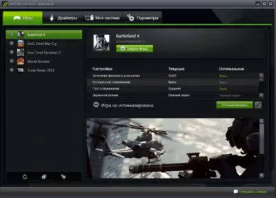 В разделе «Игры» можно выбрать нужный проект и нажать «Оптимизировать». Приложение подключается к облачному сервису NVIDIA и подбирает оптимальные графические параметры на основе конфигурации процессора, видеокарты и монитора. Большинство пользователей используют рекомендуемые настройки, однако ручная корректировка также доступна.