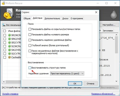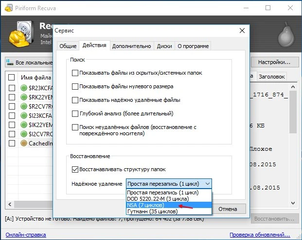 Помимо возврата файлов, Recuva поддерживает функцию безопасного удаления — затирание данных таким образом, чтобы их невозможно было восстановить специализированными средствами. Пользователь может выбрать метод перезаписи магнитной поверхности диска.