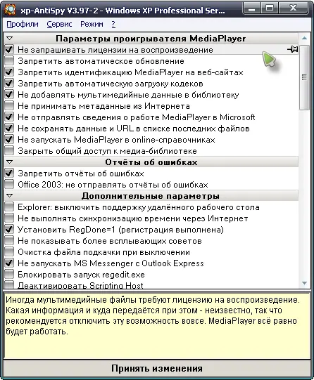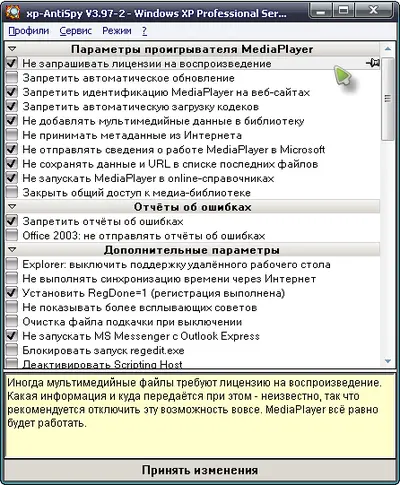 XP-AntiSpy предоставляет подробную информацию о параметрах, которые могут влиять на безопасность и приватность, а также позволяет изменить их несколькими кликами. Пользователь получает возможность отключить нежелательные службы, запретить автоматическую отправку данных и ограничить потенциально уязвимые функции системы.