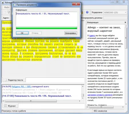 Если вы занимаетесь копирайтингом, рерайтом или ведёте собственный сайт, контроль уникальности текста — обязательный этап работы. Проверить материал на совпадения с другими публикациями поможет Advego Plagiatus — бесплатная программа для анализа текста на заимствования в интернете.