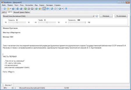 Бесплатная программа для озвучивания текста, которая позволяет прочитать вслух любой текстовый файл или введённый с клавиатуры текст, выбрать голос диктора и сохранить результат в аудиофайл — это удобное решение для тех, кто хочет слушать, а не читать.